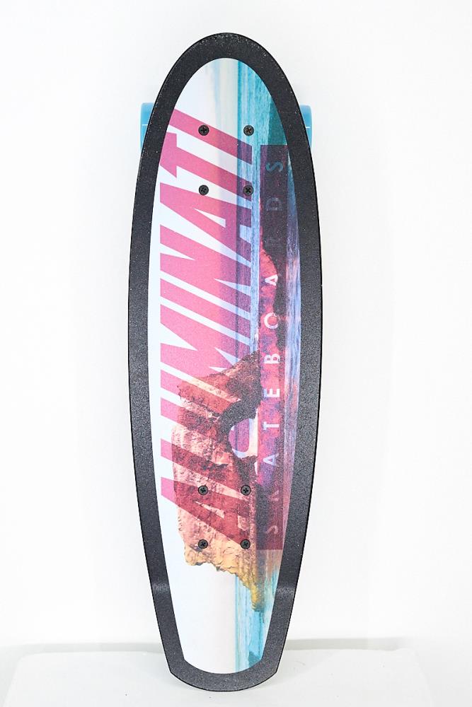 Aluminati Kpl Cruiser Seafoam [Modell A-Frame]Length: 24 inchesWidth: 7 inchesAluminati Grip3.25 inch Aluminati Trucks78A 60 mm Aluminati WheelsAbec 7 bearingsHier treffen Innovation und klassisches Design aufeinander. DerAluminium-Cruiser ist die Erleuchtung für alle, die das Besondere suchen? der ?Seafoam?-Cruiser von Aluminati! Sein Shape ist ebenso wie die Grafik vom Surfeninspiriert und gibt dir das Gefühl darauf die endlose Welle auf Asphalt zu surfen. Hergestellt ausfeinstem recyceltem Aluminium aus der Flugzeug-Industrie bietet dir dieser wendige Flitzer alleswas du dir von einem Minicruiser wünschst. Es hat eine kompakte Größe von 24 Inch und misstdamit knapp 61 cm. So lässt er sich überall mit hin nehmen und bei Bedarf im Rucksack oderSchließfach verstauen. Zudem besitzt er ein voll funktionales Tail und ist somit nicht nur zumcruisen bereit, sondern wird auch zu deiner Lieblingswaffe wenn es ums tricksen geht. Ollies,Fliptricks, Turns ? alles kein Problem mit dem stabilem Aluminiumtail. Ausgestattet ist derCruiser mit wendigen Aluminati Trucks und weichen Rollen in 78 A die mit einem Durchmesservon 60mm problemlos über Unebenheiten drüber rollen. Das Shape ist vom klassischenSurfboard-Design inspiriert und bietet eine angenehm breite Standfläche. Ein weiterer Clou istdie kratzfeste Grafik, die sich nicht nur auf der Unterseite des Decks befindet sondern auch aufder Oberseite sichtbar ist. Möglich wird dies durch das spezielle Clear-Grip, dass deinen Füßengleichzeitig besten Halt bietet. Der Aluminati Cruiser kommt in bester Qualität und mitgarantiertem Spaßfaktor ? beim cruisen durch die City, im Skatepark und sogar in der Bowl. Alsonichts wie ran an den Minicruiser der besonderen ArtALUMINATI SKATEBOARDSDen Minicruiser kennen wir ja schon - ein kleines, wendiges Skateboard mit großen, weichenWheels. Dass es den schon aus Plastik gab und wieder neu gibt, ist auch bekannt. Aber jetztkommt ein Cruiser, der aus dem Material besteht, das eigentlich unser Lieblingsgetränk mitwenig Gewicht verpackt und es kühl und frisch hält ? Aluminium. Die Jungs und Mädels vonAluminati machen schicke und funktionelle Cruiser aus recyceltem Aluminium, welches aus derFlugzeugherstellung stammt. Alle Bestandteile des Cruisers werden von Aluminati in höchsterQualität hergestellt, damit du lange Freude daran hast. Sie bieten die Besonderheit, dass dukratzfeste Grafiken auf der Unter- und sogar auf der Oberseite deines neuen Lieblingscruiserssiehst. Ein revolutionäres Clear-Grip wurde in das Material integriert und sorgt dafür, dass duimmer siehst, was du gerade fährst.