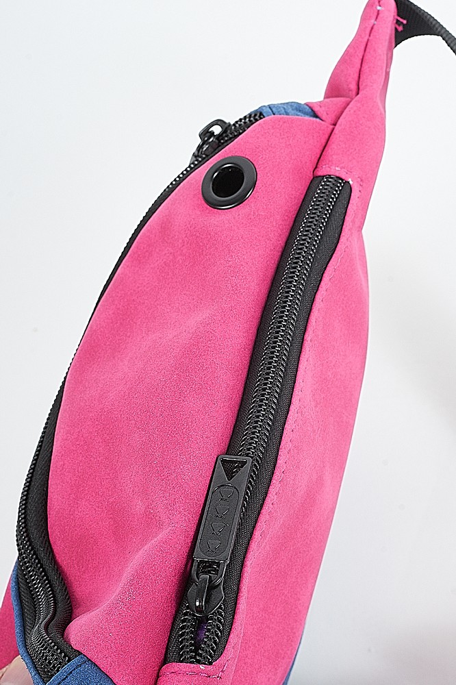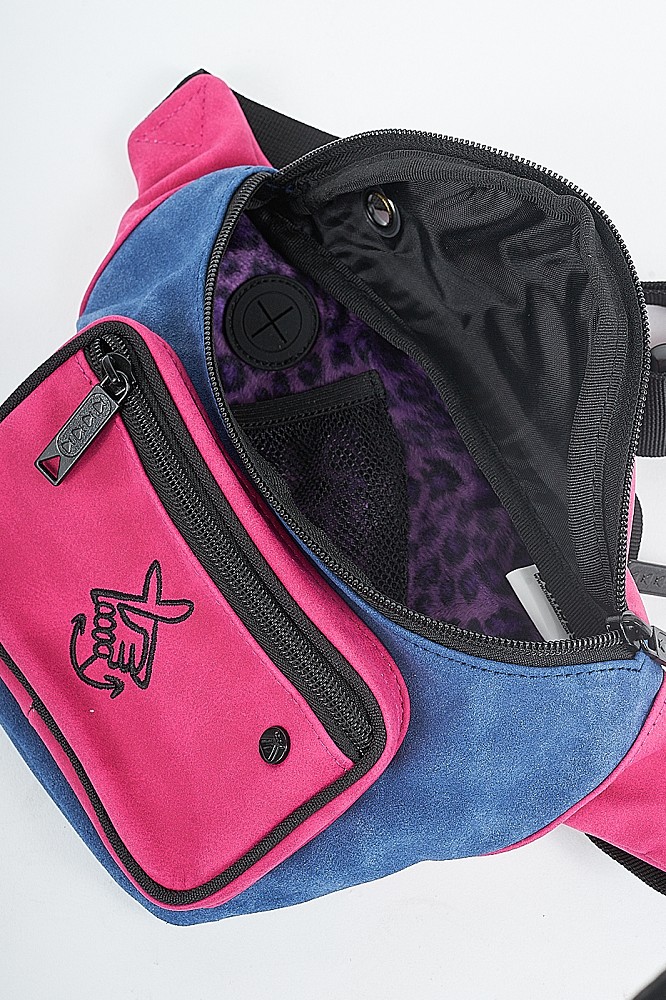 NAVY & PINK SUEDE PANELSPURPLE ANIMAL PRINT LININGADJUSTABLE WAIST STRAPBUMBAG X FRIENDSHIP LOGO EMBROIDERED ON THE FRONT POCKET.IN&OUT MULTI-CORD ACCESS PORTWOVEN CHARGER OR CELL PHONE STORAGE POUCH6”(H) X 8”(W) X 3.5”(D)