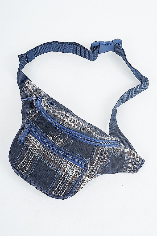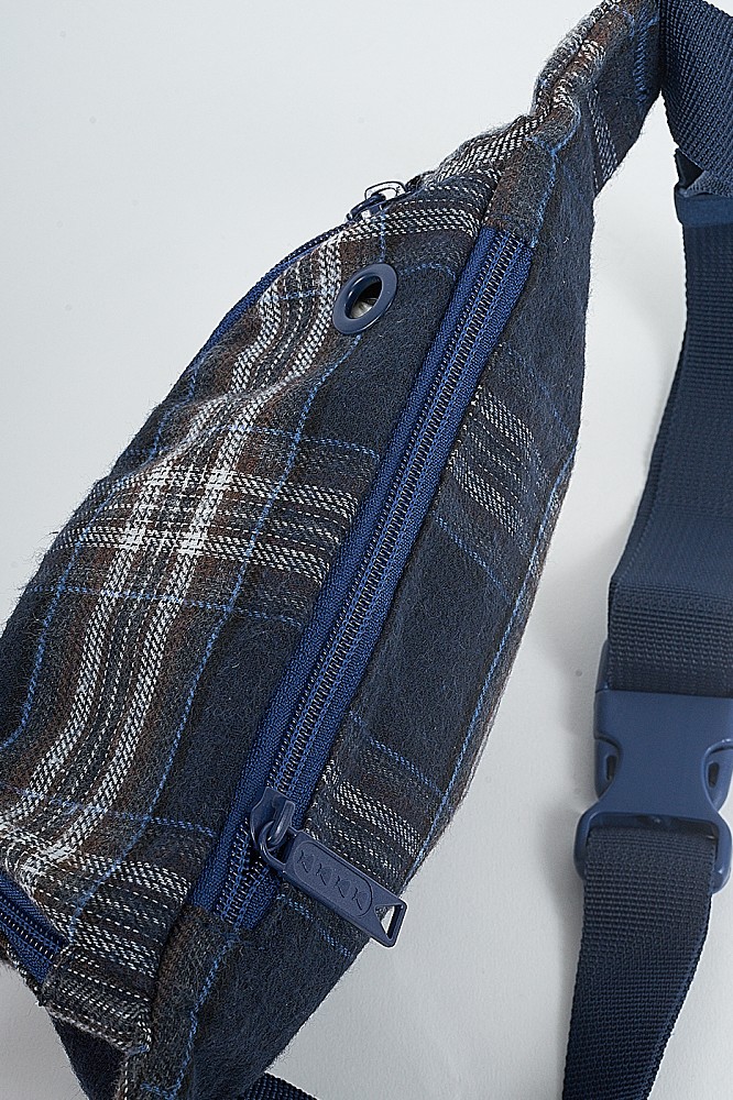 NAVY BLUE PLAIDNAVY BLUE NYLON LININGADJUSTABLE WAIST STRAPNICKEL SACK LOGOIN&OUT MULTI-CORD ACCESS PORTWOVEN CHARGER OR CELL PHONE STORAGE POUCH6”(H) X 8”(W) X 3.5”(D)
