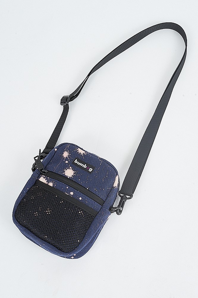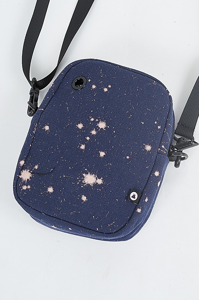 NAVY DENIM BLEACHED WASHEDPURPLE NYLON LININGSINGLE POUCHADJUSTABLE SHOULDER STRAPWOVEN STRIP LOGOIN&OUT MULTI-CORD ACCESS PORTWOVEN CHARGER OR CELL PHONE STORAGE POUCH6.5”(H) X 5”(W) X 2.25”(D)