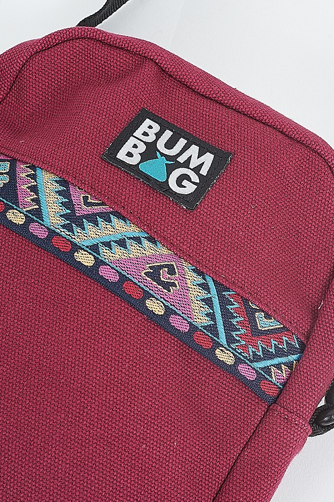 MAROON CANVASANIMAL PRINT LININGADJUSTABLE WAIST STRAPWOVEN BUMBAG LOGOIN&OUT MULTI-CORD ACCESS PORTDOUBLE STORAGE SYSTEM8”(H) X 6”(W) X 2.5”(D)