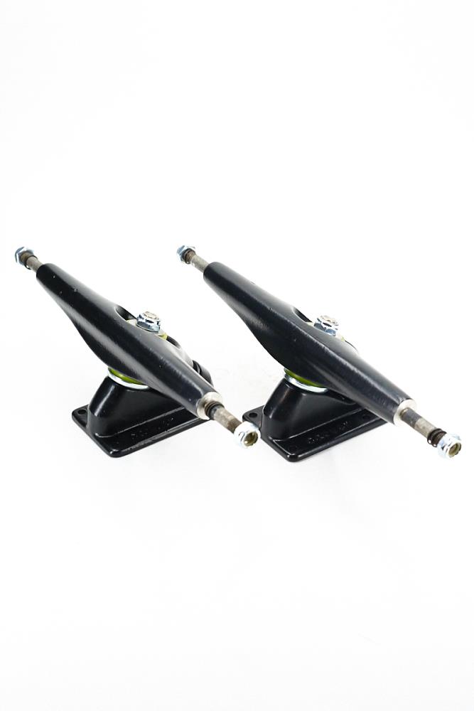 Diese Achse war jahrelang in der Entwicklung und somit unser kleines dunkles Geheimnis das wir mit unseren Freunden getestet und perfektioniert haben. Es ist die traditionelle 50 Grad RKP (Reverse Kingpin) Achse die wir auf der Mikorebene kritisiert haben und alle Fehler ausgemerzt haben. Der gerade Kingpin löst die Kante etwas, so dass du eine geschmeidige Bandbreite an härteren Bushings benutzen kannst, die die Mitte steifer machen und somit das Pushen und die Geschwindigkeit stabilisieren. Die weichere Kante macht diese Achsen zu großartigen Hügel-Carvern und erleichtert das Einleiten des Slides. Dies ist ein symmetrisches Paar 7.5" (10" Achsbreite) Achsen, die in stone aluminium oder schwarzem pulverbeschichtetem Finish erhältlich sind.