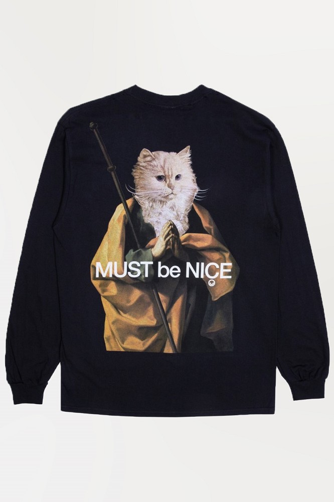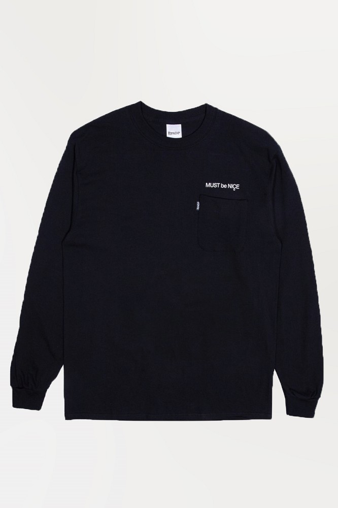 Das RIPNDIP Nermus Longsleeve kommt in schwarz mit einem "MUST be NICE" Schriftzug auf der linken Brust. Unter dem Schriftzug befindet sich eine aufgesetzte Brusttasche. Auf der Rückseite des Longsleeve befindet sich eine große Lord Normel Grafik durch die ebenfalls der Schriftzug "MUST be NICE" geht. Das Longsleeve besteht aus 100% Baumwolle.