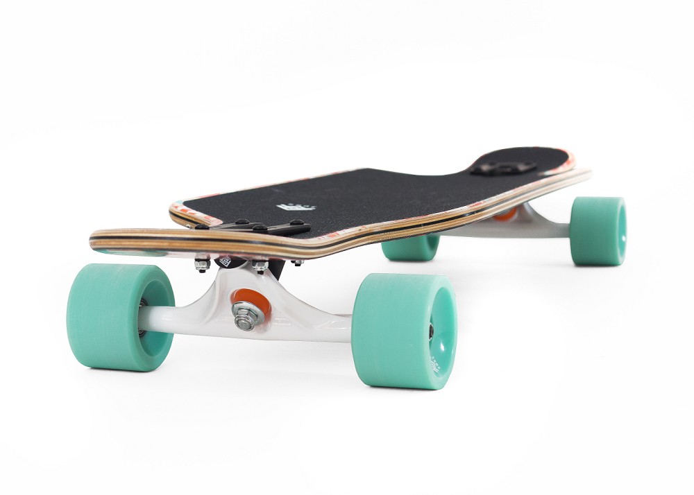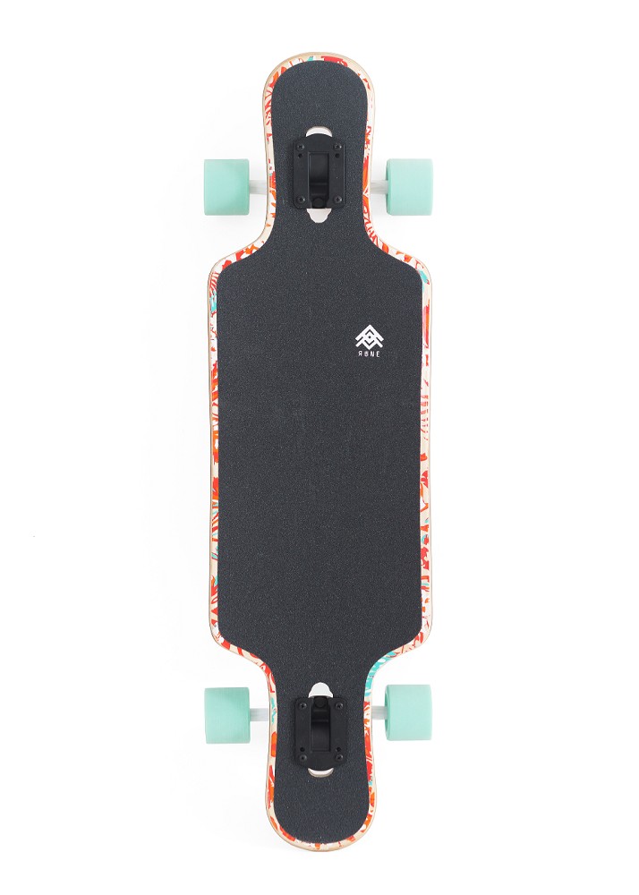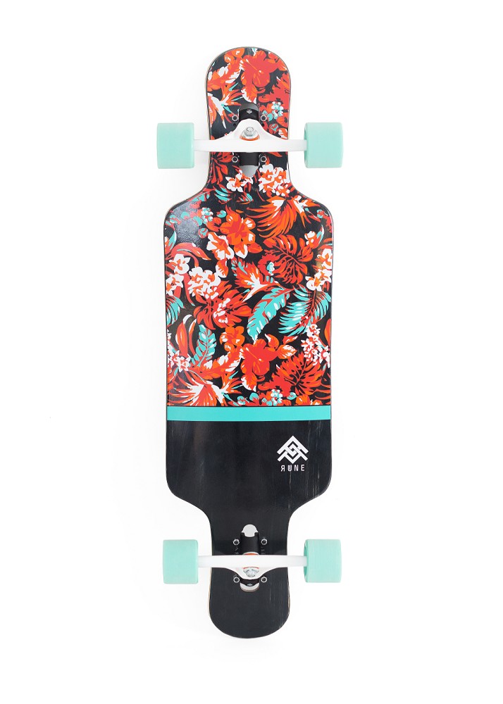 Rune Skateboard supplies bieten dir die besten Longboards, Cruiser und Skatesupplies für deine Abenteuer im Großstadtdschungel. Durch ausgiebiges Testen liefern unsere ausgewählten Shapes beste Qualität und perfekt abgestimmtes Zubehör, für garantierten Fahrspaß. Das Drest ist das stabile Drop-Through Longboard von Rune Skates, dass dich auf all deine Longboard-Abenteuer begleitet! Es kommt als voll-symmetrisches, bidirektionales Shape wodurch es egal wird wo vorne und hinten ist - wie auch immer du es drehst und wirbelst, es bietet dir immer alle Stance- und Ride-Optionen. Es hat eine kurze Wheelsbase und bietet dir ordentlich Nose und Tail. Dadurch kannst du deinem Trickpotential freien Lauf lassen. In Kombination mit der Drop-Through-Achsmontage durch die das Brett tiefer liegt wird es stabiler und eröffnet eine Fülle an Möglichkeiten für Freestyle und Sliding. Nose und Tail bieten genug Platz für den ganzen Fuß und somit ausreichend Grip für Kicks und Tricks nach Lust und Laune. Die Cutouts erlauben dir super enge Turns zu fahren ohne fiese Wheel-Bites zu bekommen. Für mehr Flex und ein angenehmes Brettgefühl sorgt die 1,2mm dicke Schicht Fiberglas auf der Unterseite des Decks. Das Drest lässt sich dank der stone ground Wheels auch prima sliden! Es kommt mit stylischem, tropischen Floral-Print und schafft damit Surf-Atmosphäre. Was braucht dein Longbaord mehr? Enjoy your Ride!Widerstandsfähigiges Drop-Through LongboardVoll-symmetrisches Shape für noch mehr FreiheitDie kurze Wheelbase macht das Board wendigerGroße Nose- und Tailkicks für FreestyleMit Fiberglas konstruiert für leichten Flex Breite 23cm / 9.89" Länge 101,6 / 40.45" | leichtes Concave | Drop Through 7 Schichten Furnier Bottom-Schicht mit 1.2mm Fibershield 70mm 80 A stone ground wheels Trucks 180 mm inverted Trucks ABEC 7